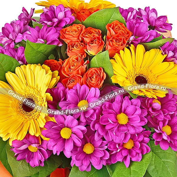 Стандартный (на фото): хризантема кустовая ромашковая (фиолетовая) - 3 шт, гербера желтая - 3 шт, роза кустовая оранжевая - 1 шт (в центре), рускус или салал, фетр оранжевый + шоколад DOVE в подарок(возможна замена на шоколад "Коркуноф" " Ritter sport" или "Milka").